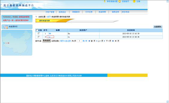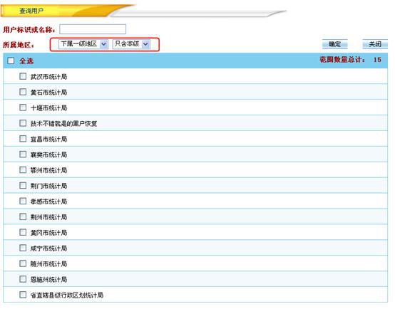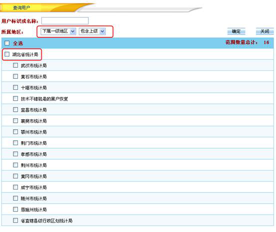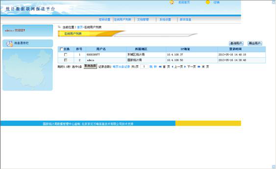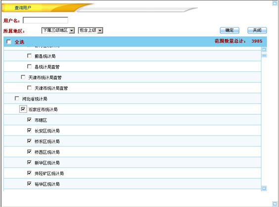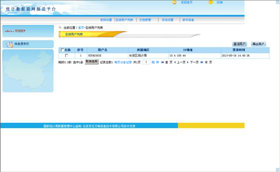 选择好范围以后,点击“确定”,“查询用户设置”对话框关闭,回到在线用户列表页面,系统显示用户选择处理地范围内的在线用户,比如下图所示,用户选择“石家庄市统计局”及其下属所有处理地: