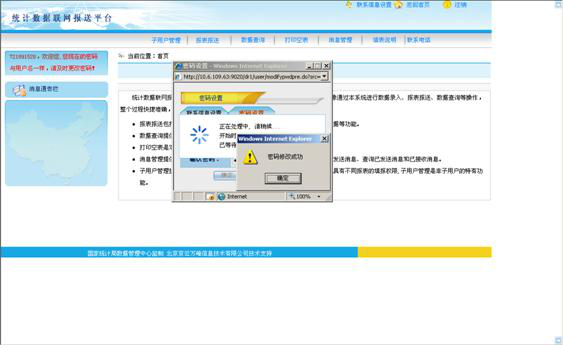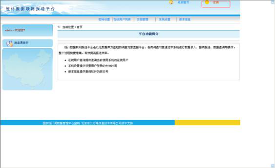 在统计数据联网报送平台的主页面右上角的位置,点击“注销”,用户退出当前系统,显示用户登录页面,如图9.7-1图9.7-2所示: