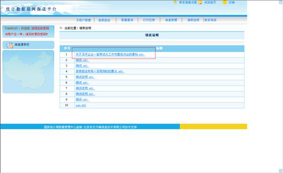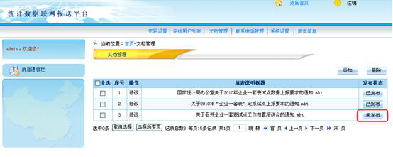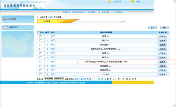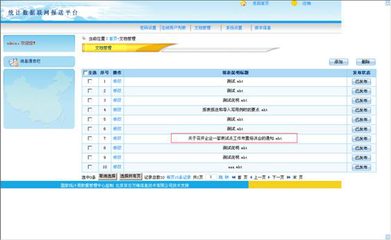 比如下图中,“填表说明标题”为“关于召开企业一套表试点工作布置培训会的通知.mht”的文档,发布状态为“已发布”: