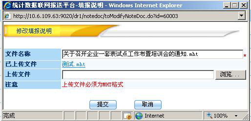 已上传文件显示在修改填报说明对话框中,用户可以修改文件名称,重新上传文件,更改完成以后,点击“提交”,系统提示:修改填表说明成功,如下图所示: