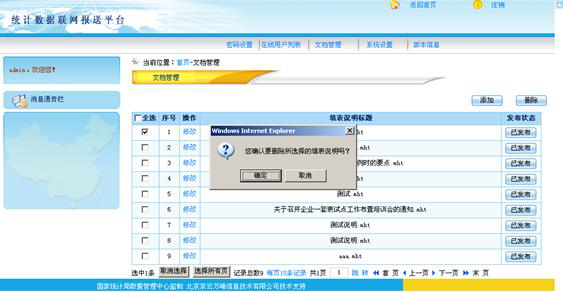 文档管理页面,选择要删除的文档,点击“删除”按钮则提示是否删除,如下图所示: