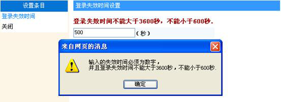 根据页面提示:登录失效时间不能大于3600秒,不能小于600秒。如果输入数值小于600或者大于3600秒,点击“确定”以后,系统会弹出对话框提示:输入的失效时间必须为数字,并且登录失效时间不能大于3600秒,不能小于600秒,如图9.4-2所示: